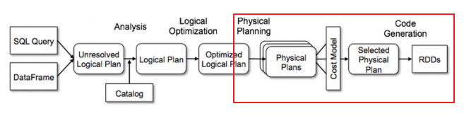 - 최적화된 Logical Plan이 어떻게 클러스터에서 실행될지 정의하는 Physical Plan이 생성된다.
