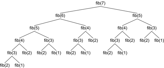 fib(7)을 구하기 위해서는 fib(6)와 fib(5)가 필요하다. 그리고 fib(6)을 구하기 위해서는 fib(5)와 fib(6)이 필요하다. 이 경우 살펴보면 fib(7)과 fib(6)에서 fib(5)가 반복된다. 즉, 작은 문제가 반복되는 구조라고 볼 수 있다. - 최적 부분 구조