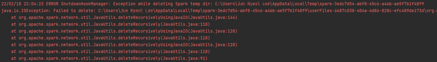 살펴보니 Spark를 실행하는 동안 %Temp% 폴더에 폴더를 생성하는데, 그것을 지울 수 없다는 내용이다.