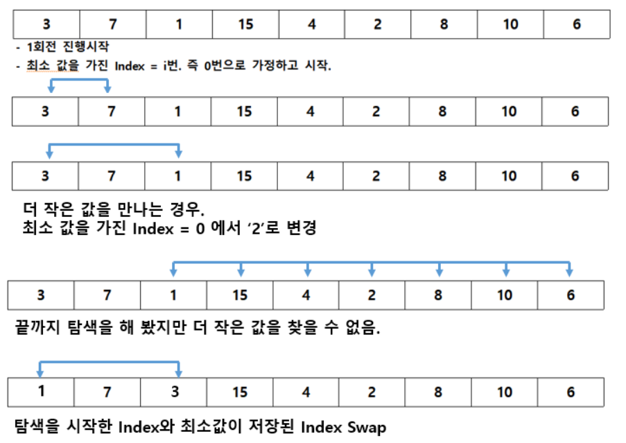 - 끝까지 도달했을 때, 탐색을 시작하는 Index의 값과 최소 값을 가지는 Index의 값을 swap 한다.