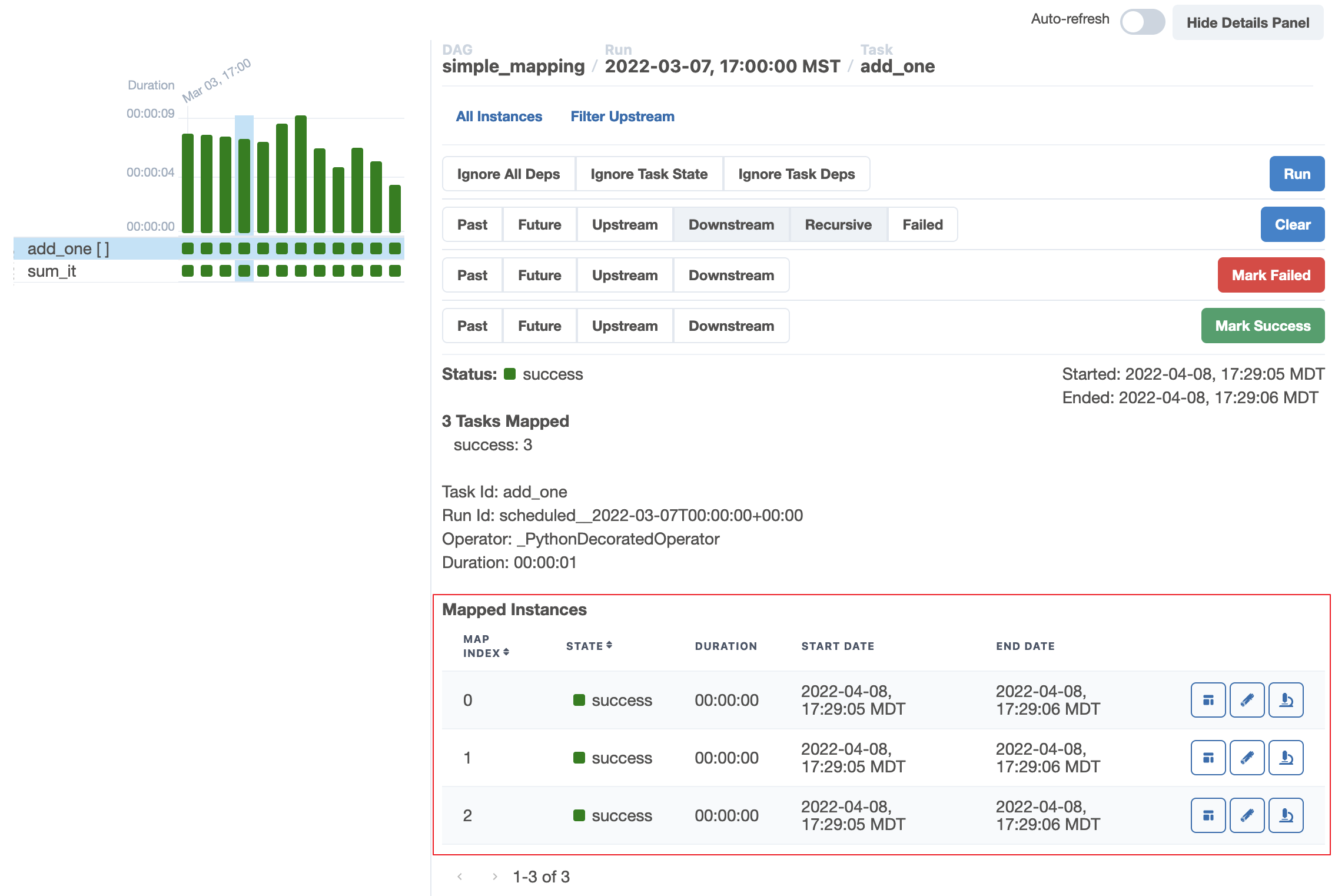 added_values = add_one.expand(x=[1, 2, 3]) # List์ ๊ธธ์ด๊ฐ 3์ด๋ค. ๋ฐ๋ผ์ add_one Task๊ฐ 3๊ฐ ์์ฑ๋๋ค.