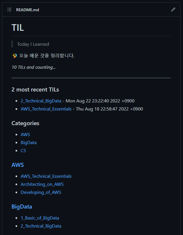 다만, TIL을 진행하다보면 새로운 파일을 올릴 때마다 README.md 파일을 업데이트하는 것이 상당히 귀찮습니다.